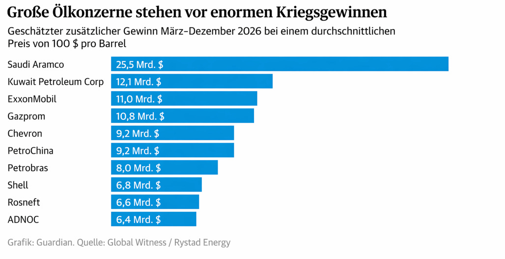 Wie eine Analyse des Guardian zeigt, gehören Saudi Aramco, Gazprom und ExxonMobil zu den größten Profiteuren dieses Geldsegens. Alleine diese 100 Unternehmen werden bis Jahresende 234 Milliarden US-Dollar verdienen, sofern der Ölpreis weiterhin durchschnittlich bei 100 US-Dollar pro Barrel liegt. Dies kommt zu den ohnehin enormen Gewinnen hinzu.