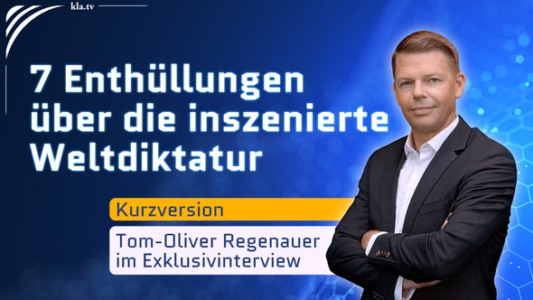 Der unabhängige Manager und Journalist Tom-Oliver Regenauer gab Kla.TV im Mai 2025 ein Interview zum Thema „7 Enthüllungen über die inszenierte Weltdiktatur“. [www.kla.tv/38270] Regenauer zeigt darin unter anderem: